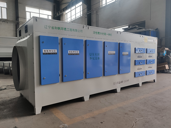 當(dāng)惡臭氣體利用排風(fēng)設(shè)備輸入到本凈化設(shè)備后,凈化設(shè)備運(yùn)用高能C波光束及臭氧對(duì)惡臭氣體進(jìn)行協(xié)同分解氧化反應(yīng),使惡臭氣體物質(zhì)其降解轉(zhuǎn)化成低分子化合物、水和二氧化碳,再通過(guò)排風(fēng)管道排出室外。